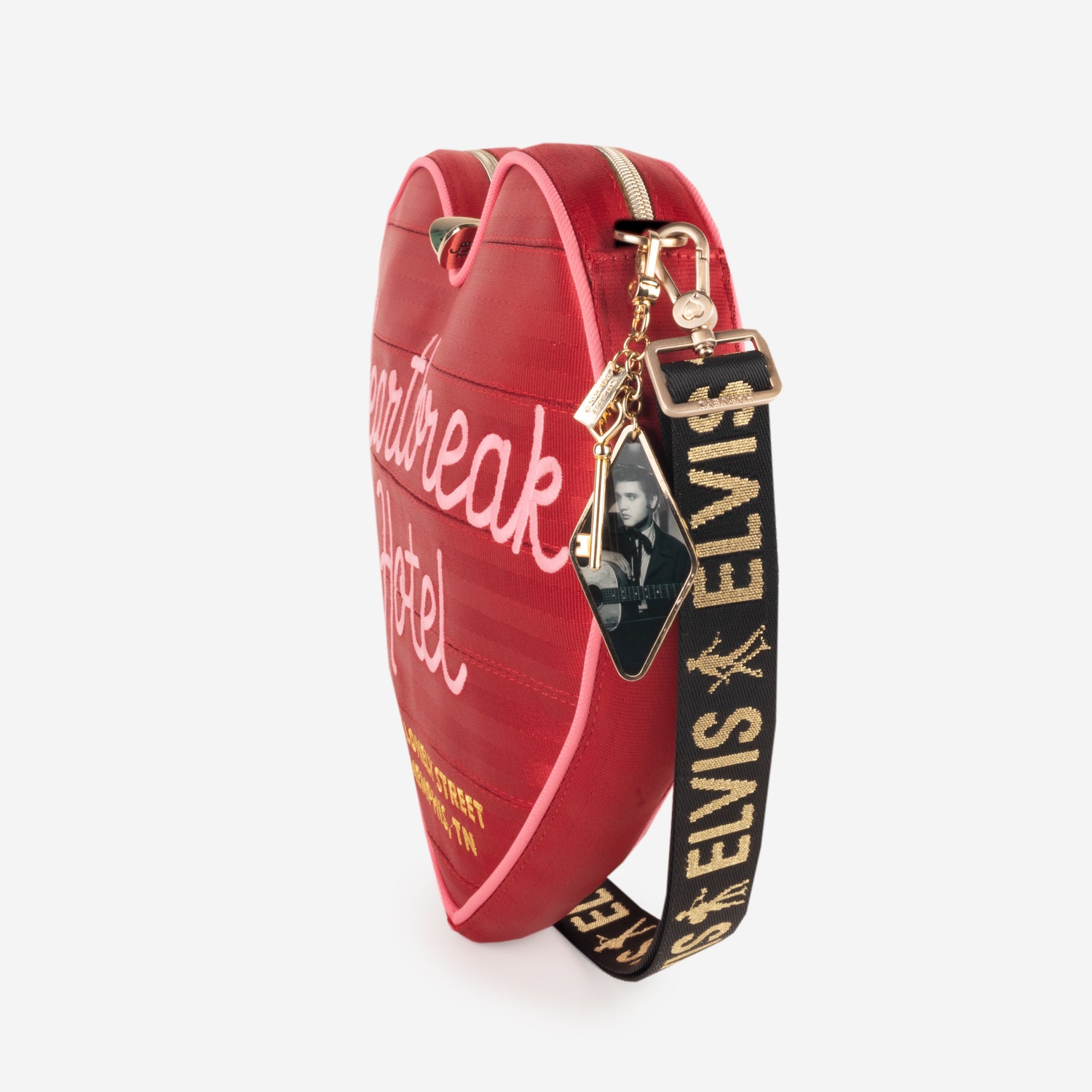 Take a walk down Lonely Street with this crossbody bag inspired by Elvis’s hit song, Heartbreak Hotel. This bag features scarlet seatbelt, embroidered details, and a special crossbody strap that reads “Elvis”. Comes with a hotel key charm and a lining that features an assortment of Elvis’s famous album covers.
