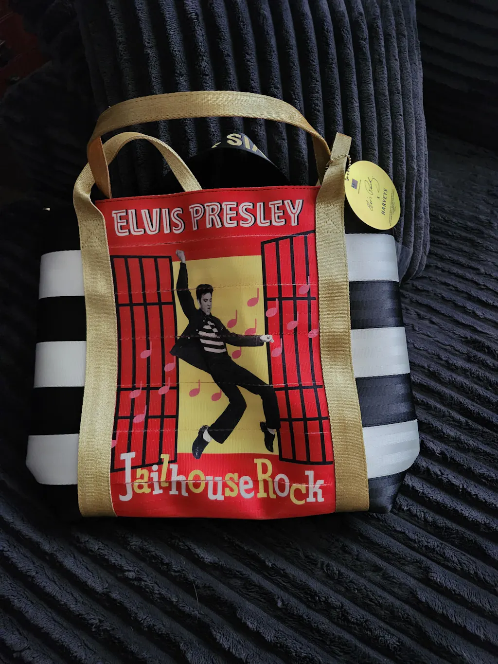 Let’s rock! This Poster Tote features Elvis in his iconic role in Jailhouse Rock. Features black, white, and gold seatbelt with a special crossbody strap that reads “Elvis”. This bag comes with a charm depicting Elvis midpose in his Jailhouse Rock dance sequence and a lining that features an assortment of his famous album covers.