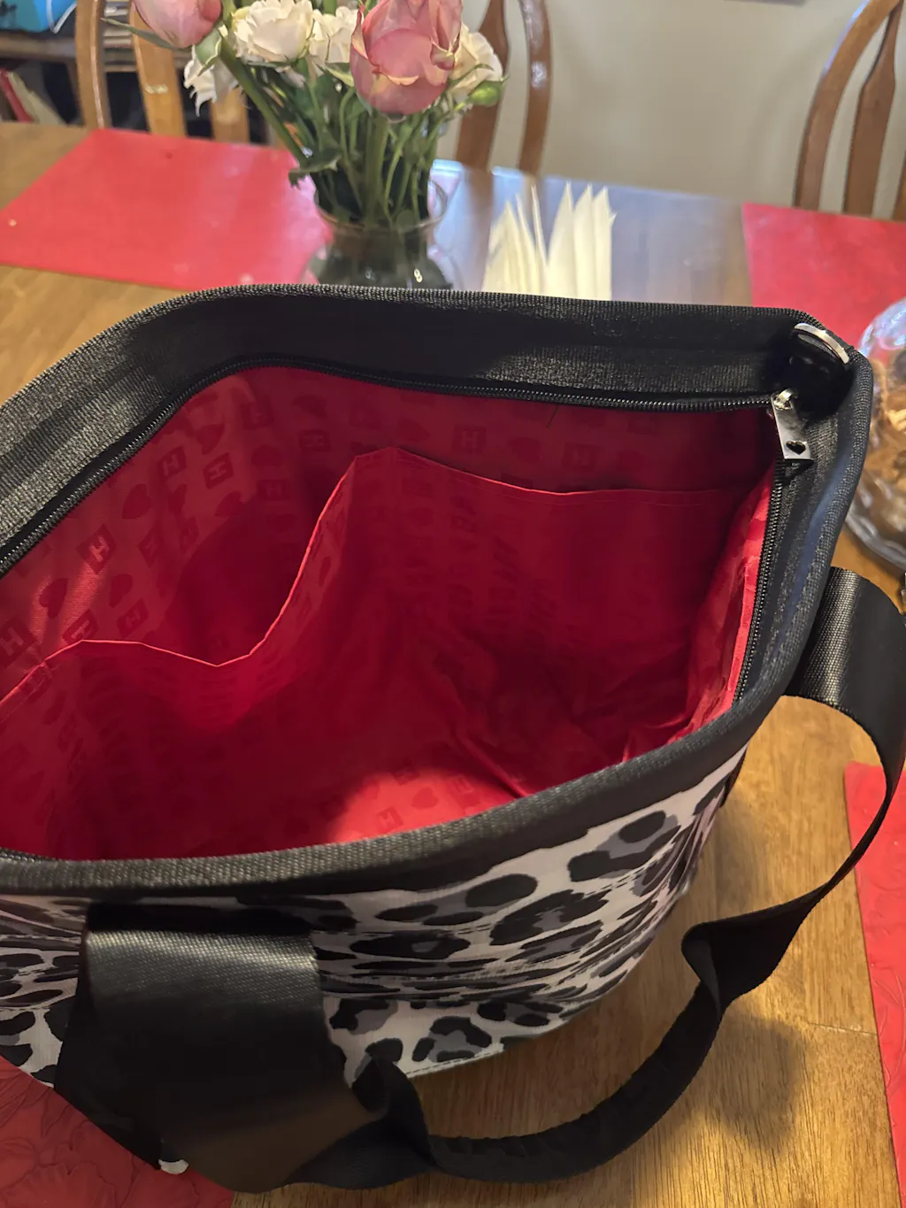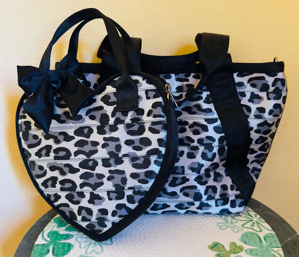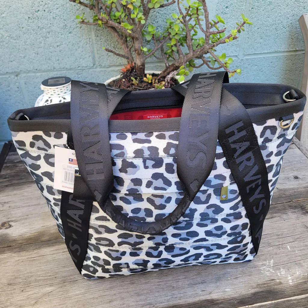 Unleash your wild side with our Ice Leopard Medium Boat Tote. This tote features our Ice Leopard print with our special debossed Harveys handles and our red monogram lining inside. Also includes d-rings perfect for attaching an additional Click n Carry adjustable strap or attaching one of our keychains.