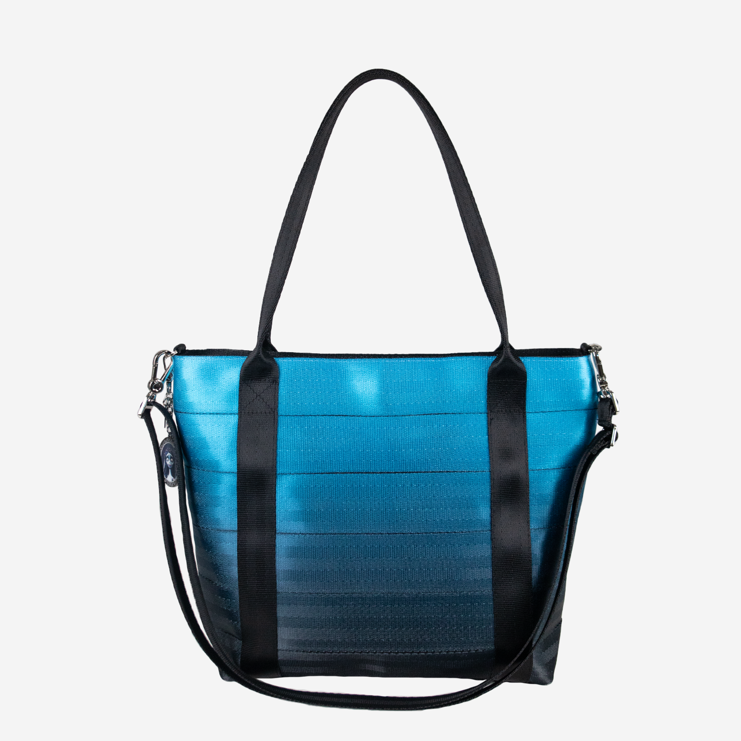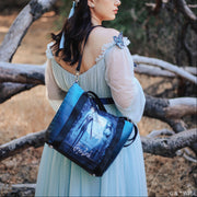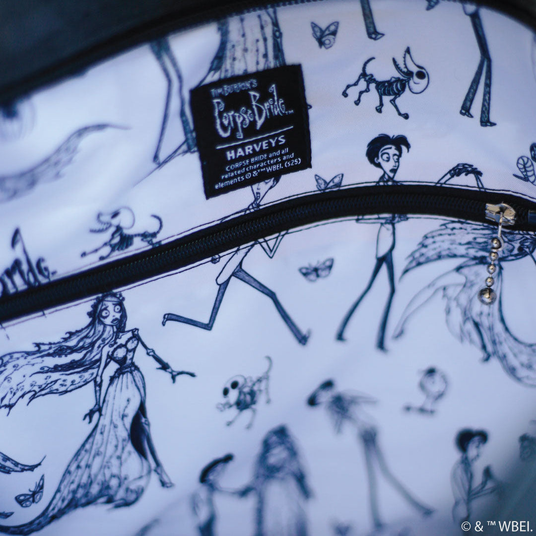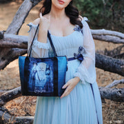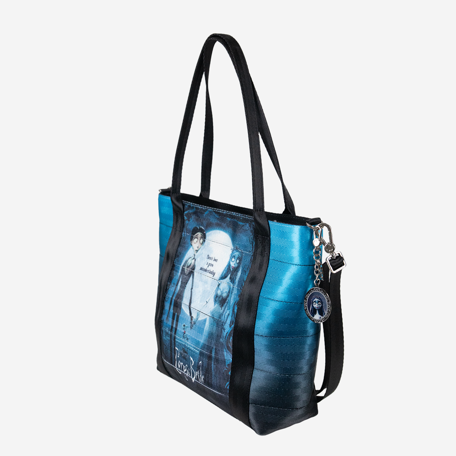 This Medium version of our fan-favorite Poster Tote inspired by Tim Burton’s Corpse Bride™ is the perfect size for your daily essentials! With a gradient from Blue to Black on the backside featuring horizontally stitched seatbelt and fully lined, along with top handles, a detachable crossbody strap and metal feet, it’s ready for all of your adventures!