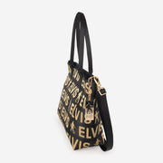 Rock out and feel just like The King of Rock & Roll™ with this Mini Streamline Tote. This bag features special black and gold woven seatbelt that reads “Elvis”. Comes with a gold charm and lining that features an assortment of Elvis’s famous album covers.